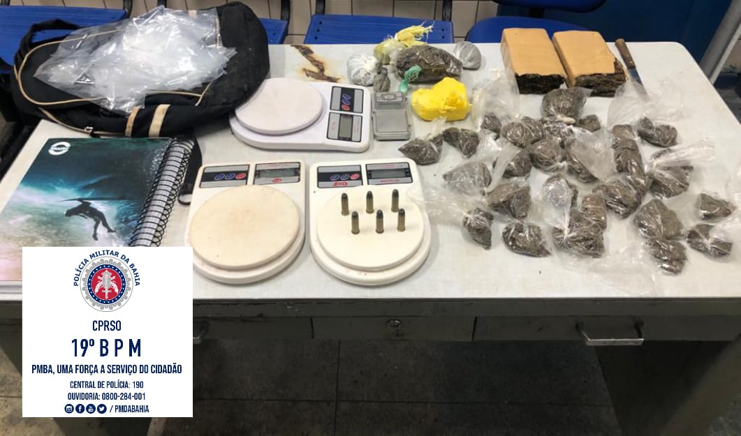 Na madrugada de ontem (06), uma guarnição do 19º BPM, fazia rondas no bairro do Joaquim Romão, e abordaram um homem suspeito. Com ele foi encontrado 02 Tablete de maconha, 01 barra e 02 petecas de cocaína, poções de maconha pronta para venda, 04 balanças de precisão, além de munição calibre.38. O acusado e todo o material apreendido, foram apresentados na DT de Jequié.